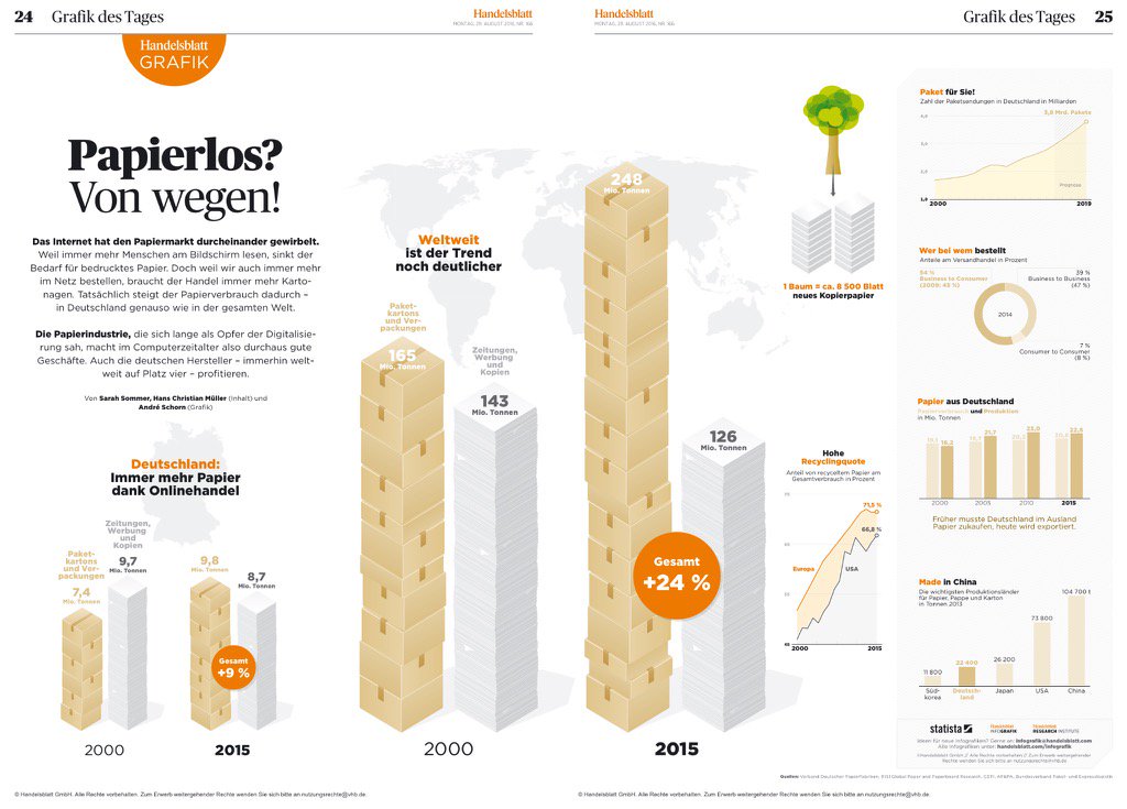 Die Papierindustrie ist Gewinner der Digitalisierung - bisher. Eine interessante Grafik im (Prämiumbereich des) Handelsblatt zeigt das Wachstum des Papierbedarfs in Deutschland. Vom papierlosen oder wenigstens papierarmen Büro sind wir noch weit entfernt.